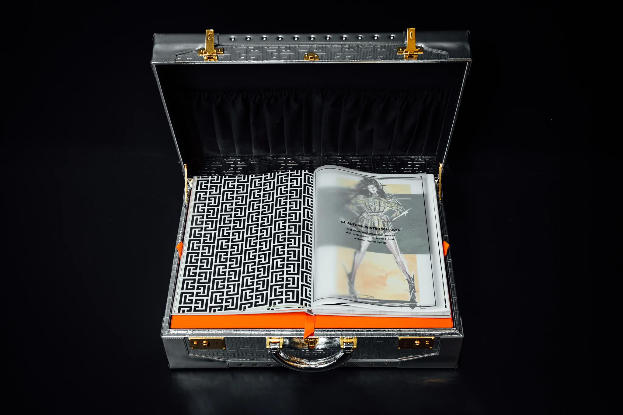 Silver fabric bound book embossed with Balmain's iconic monogram and housed inside a chrome and fluorescent orange suitcase, of which only four exist.